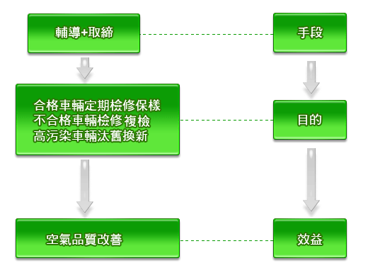- 輔導+取締→合格車輛定期檢修保樣不合格車輛檢修複檢高污染車輛汰舊換新→空氣品改善